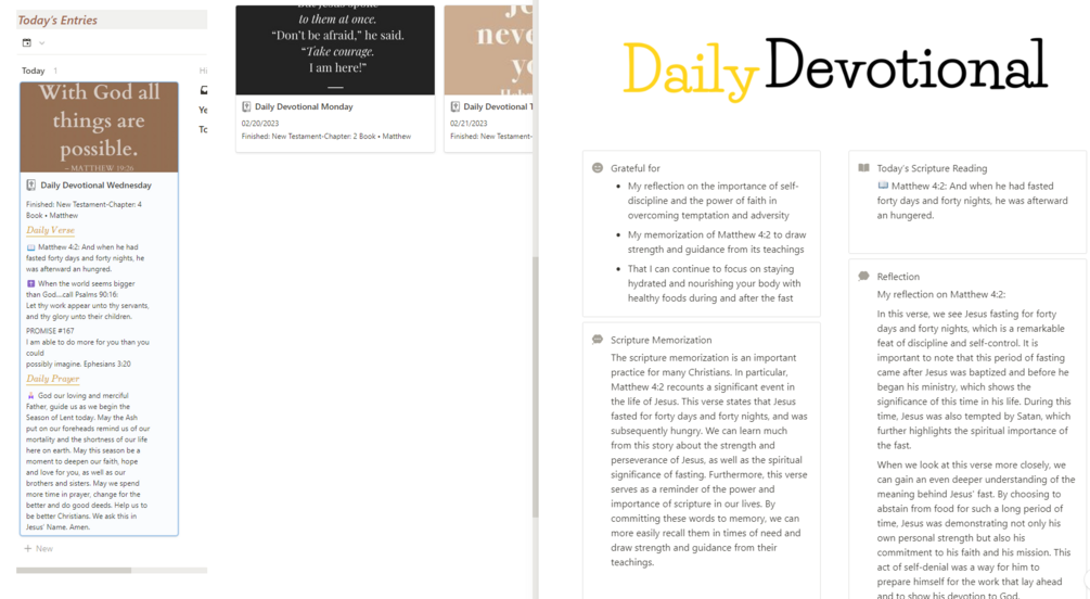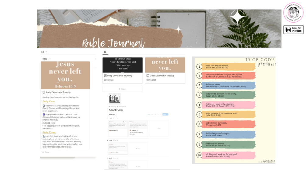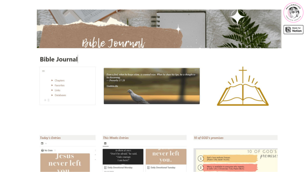 Bible Journal is a Notion template that gives people a fun and meaningful way to study the Bible. It is a space that encourages users to explore the Bible more deeply and to document their thoughts and reflections, as well as to track their progress as they study and read the Bible. It provides a broad range of tools and features that make it easy to keep track of key passages, and to write notes. With Bible Journal, users can gain a better understanding of the Bible and its wisdom, while also expressing themselves in a unique and personal way.