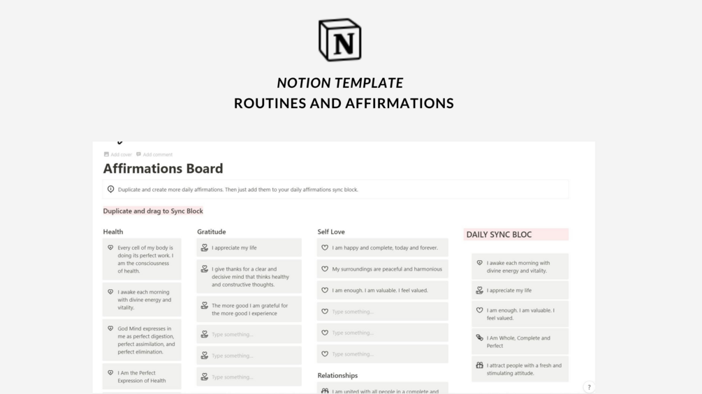 Organize your daily schedule with ease using this functional Notion template. The template includes four sections for your Morning, Afternoon, Evening, and Bedtime Routines, allowing you to structure your day efficiently. In addition to planning your routine, you can also boost your mood and motivation by adding daily affirmations to your schedule. The user-friendly drag-and-drop affirmation board is included, making it simple to customize your daily affirmations to fit your needs. Stay on top of your daily tasks and goals by incorporating this template into your workflow.