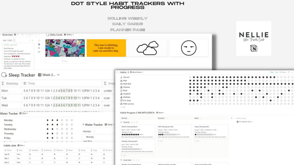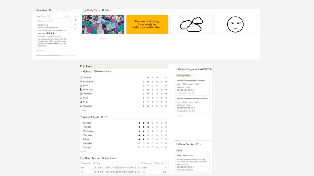 The template includes a range of features to help you stay organized and on track. Keep track of your water intake and sleep patterns with the customizable trackers. The daily card selector allows you to view see the weather, your mood, favorite quotes and favorite pictures. Choose from three different style habit trackers to find the one that works best for you and track your progress over time.